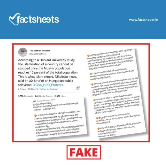"ഒരു രാജ്യത്തെ മുസ്‌ലിം ജനസംഖ്യ അവിടുത്തെ മുഴുവൻ ജനസംഖ്യയുടെ 16% എത്തിയാൽ ആ രാജ്യത്തിന്റെ ഇസ്‌ലാമിക വൽക്കരണം പിന്നെ തടയാനാവില്ല"! ഈ തലക്കെട്ടിൽ ഒരു ലേഖനം, കഴിഞ്ഞ രണ്ടു മൂന്നു വർഷമായി  സമൂഹ മാധ്യമങ്ങളിൽ വ്യാപകമായി പ്രചരിച്ചു കൊണ്ടിരിക്കുന്നു. 2018 ജൂൺ 22ന് ഹംഗേറിയൻ ടെലിവിഷൻ പരിപാടിയിൽ, 'ഇസ്‌ലാം മത വിദഗ്ദ'യായ നെക്കോലേട്ട ഇൻസേയ് നടത്തിയ ഒരു അഭിമുഖമാണ് ഇതിന്റെ സ്രോതസ് എന്ന് ലേഖനത്തിൽ പറയുന്നുണ്ട്. പക്ഷേ, രസകരമായ കാര്യം, ഈ വാദം ഉന്നയിക്കുന്ന പല എഴുത്തുകളുടെയും…