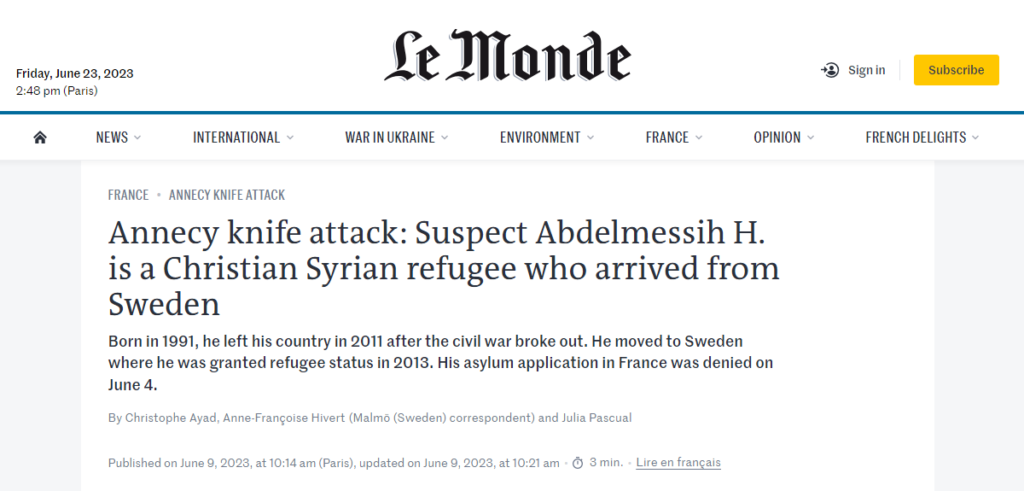 ഫ്രാൻസിലെ ഒരു പാർക്കിൽ, പിഞ്ചുകുട്ടികളെയടക്കം നിരവധി ആളുകളെ കത്തി കൊണ്ട് കുത്തിപ്പരിക്കേല്പിക്കുന്ന ഒരു അക്രമിയുടെ ദൃശ്യങ്ങൾ സമൂഹ മാധ്യമങ്ങളിൽ വ്യാപകമായി പ്രചരിക്കുന്നുണ്ട്. സിറിയയിൽ നിന്നുള്ള ക്രിസ്ത്യൻ അഭയാർത്ഥിയായ അബ്ദൽമസിഹ് ഹനൂൻ (31) ആണ് അക്രമിയെന്ന് ഫ്രഞ്ച് പോലീസ് കണ്ടെത്തുകയും കൊലപാതക ശ്രമത്തിന് കേസെടുക്കുകയും ചെയ്തിരുന്നു. (ഫ്രാൻസ് )