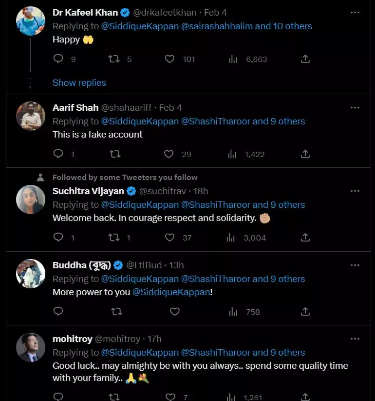 2023 ഫെബ്രുവരി 3-ന് സിദ്ദിഖ് കാപ്പൻ മോചിതനായ ശേഷം തനിക്ക് വേണ്ടി സംസാരിച്ചവർക്ക് നന്ദി അറിയിക്കുന്നു എന്ന രീതിയിൽ ഈ അക്കൗണ്ട് ട്വീറ്റ് ചെയ്തതിങ്ങനെ: