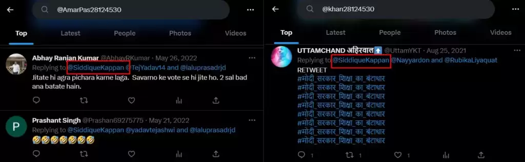 ഈ ട്വിറ്റർ ഐ.ഡി ഗൂഗിളിൽ തിരഞ്ഞപ്പോൾ ‘ഡിജിറ്റൽ ഫോറൻസിക്സ്, റിസർച്ച് ആൻഡ് അനലിറ്റിക്സ് സെന്റർ’ (DFRAC) പുറത്തുവിട്ട ഒരു റിപ്പോർട്ട് കണ്ടെത്തി. റിപ്പോർട്ടിൽ പറയുന്നതനുസരിച്ച്, ആർ.ജെ.ഡി നേതാവ് അമർ പാസ്വാന്റെ പേരിലുള്ള @AmarPas28124530, എ.ബി.പി ന്യൂസ് അവതാരക റൂബിക ലിയാഖത്തിന്റെ പേരിലുള്ള @khan28124530 എന്നീ രണ്ട് അക്കൗണ്ടുകൾക്കും ഉപയോഗിച്ചിട്ടുള്ളത് ഇതേ ട്വിറ്റർ ഐ.ഡിയാണ്. ഈ രണ്ട് ഹാൻഡിലുകളിൽ നിന്നുള്ള പഴയ ട്വീറ്റുകളും പ്രതികരണങ്ങളും പരിശോധിച്ചപ്പോൾ, അതേ അക്കൗണ്ടാണ് ഇപ്പോൾ @SiddiqueKappan എന്ന് പേര് മാറ്റിയിരിക്കുന്നതെന്ന് മനസ്സിലാക്കാൻ കഴിഞ്ഞു.