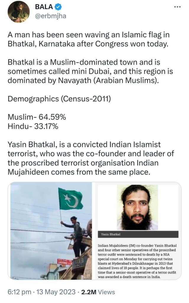 “മുസ്ലീം ആധിപത്യമുള്ള ഒരു പട്ടണമാണ് ഭട്കൽ, ഇതിനെ ചിലപ്പോൾ മിനി ദുബായ് എന്നും വിളിക്കുന്നു, ഈ പ്രദേശം നവയത്ത് (അറേബ്യൻ മുസ്ലീങ്ങൾ) ആധിപത്യം പുലർത്തുന്നു. ജനസംഖ്യാശാസ്ത്രം (സെൻസസ്-2011) മുസ്ലീം-64.59% ഹിന്ദു-33.17% നിരോധിത ഭീകര സംഘടനയായ ഇന്ത്യൻ മുജാഹിദ്ദീന്റെ സഹസ്ഥാപകനും നേതാവുമായിരുന്ന യാസിൻ ഭട്കൽ, ശിക്ഷിക്കപ്പെട്ട ഒരു ഇന്ത്യൻ ഇസ്ലാമിസ്റ്റ് ഭീകരനാണ്”, എന്ന തലക്കെട്ടോടെ BALA എന്ന ഒഫീഷ്യൽ ട്വിറ്റർ അക്കൗണ്ടിൽ നിന്നും സമാന വീഡിയോ പ്രചരിക്കുന്നു.