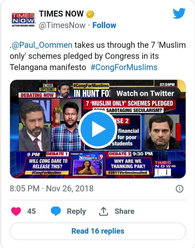 “7 ‘muslim only’ schemes pledged by congress in its telangana manifesto” എന്ന തലക്കെട്ടിൽ ടൈംസ് നൗ ചർച്ച സംഘടിപ്പിച്ചിരുന്നു.
