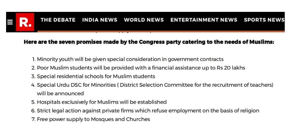 വസ്തുത: മുസ്ലിങ്ങൾക്ക് പ്രത്യേക പരിഗണന നൽകുമെന്ന വിധത്തിലായിരുന്നു ഈ വാദത്തെ ടൈംസ് നൗ, റിപ്പബ്ലിക്ക് ടി.വി എന്നിവർ വാർത്ത കൊടുത്തത്. എന്നാൽ ”പൊതുമേഖലയിലും സ്വകാര്യമേഖലയിലും ജോലി നൽകുന്നതിൽ മതപരവും ജാതിപരവുമായ എല്ലാത്തരം വിവേചനങ്ങളും അവസാനിപ്പിക്കും” എന്നാണ് യഥാർത്ഥ പരാമർശം.
