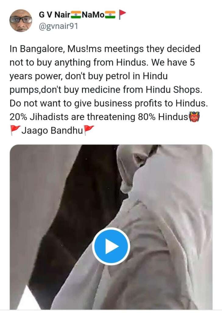 ഹിന്ദുക്കളെ പൂർണമായും ബഹിഷ്കരിക്കണം എന്ന് ആഹ്വാനം ചെയ്യുന്ന ഒരു വീഡിയോ സാമൂഹിക മാധ്യമങ്ങളിൽ വ്യാപകമായി പ്രചരിക്കുന്നുണ്ട്. ബാംഗ്ലൂരിലെ മുസ്ലിങ്ങളാണ് ബഹിഷ്കരണത്തിന് പിന്നിൽ എന്നാണ് വീഡിയോയുടെ തലക്കെട്ട്.