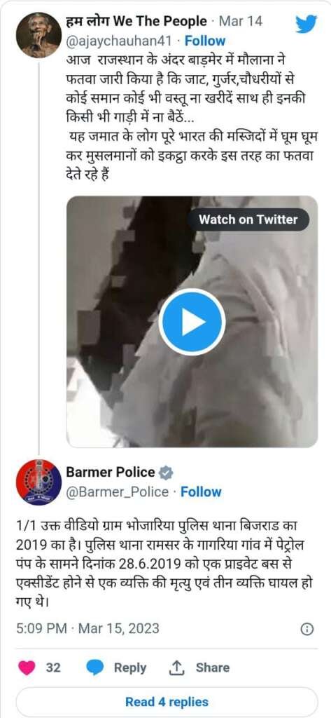 2023 മാർച്ചിൽ ഇതേ വീഡിയോ സാമൂഹിക മാധ്യമങ്ങളിൽ പ്രചരിച്ചിരുന്നു. അന്ന് രാജസ്ഥാനിലെ ബർമറിൽ ഒരു മൗലാന ഹിന്ദുക്കളെ ബഹിഷ്കരിക്കാൻ ആഹ്വാനം ചെയ്യുന്നു എന്ന പേരിലാണ് വീഡിയോ പ്രചരിച്ചത്.