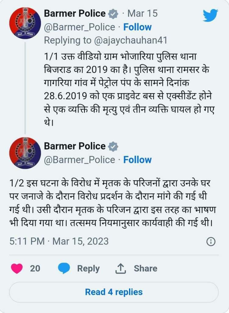 പ്രസ്തുത വീഡിയോയോട് പ്രതികരിച്ചുകൊണ്ട് ബർമർ പോലീസ്, ഈ വീഡിയോ 2019ൽ ഉള്ളതാണെന്ന് വ്യക്തമാക്കി.