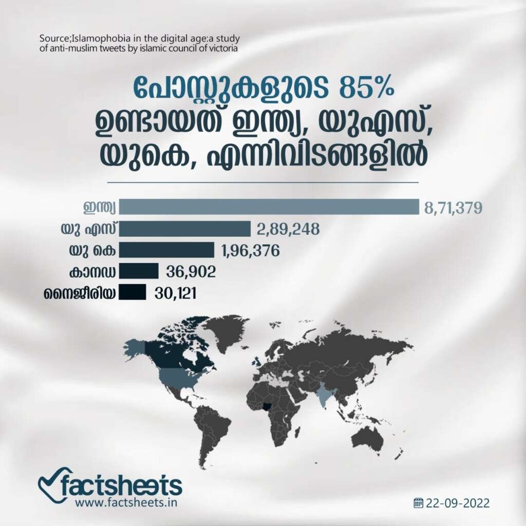 ട്വിറ്ററിൽ 2019 ഓഗസ്റ്റ് 28നും 2021 ഓഗസ്റ്റ് 27നും ഇടയിൽ 3,759,180 ഇസ്ലാമോഫോബിക് പോസ്റ്റുകൾ ഉണ്ടായിട്ടുണ്ട്. ഇന്ത്യ, യു.എസ്, യു.കെ എന്നിവിടങ്ങളിൽ നിന്ന് മാത്രം ആണ് ഇത്രയും പോസ്റ്റുകൾ.